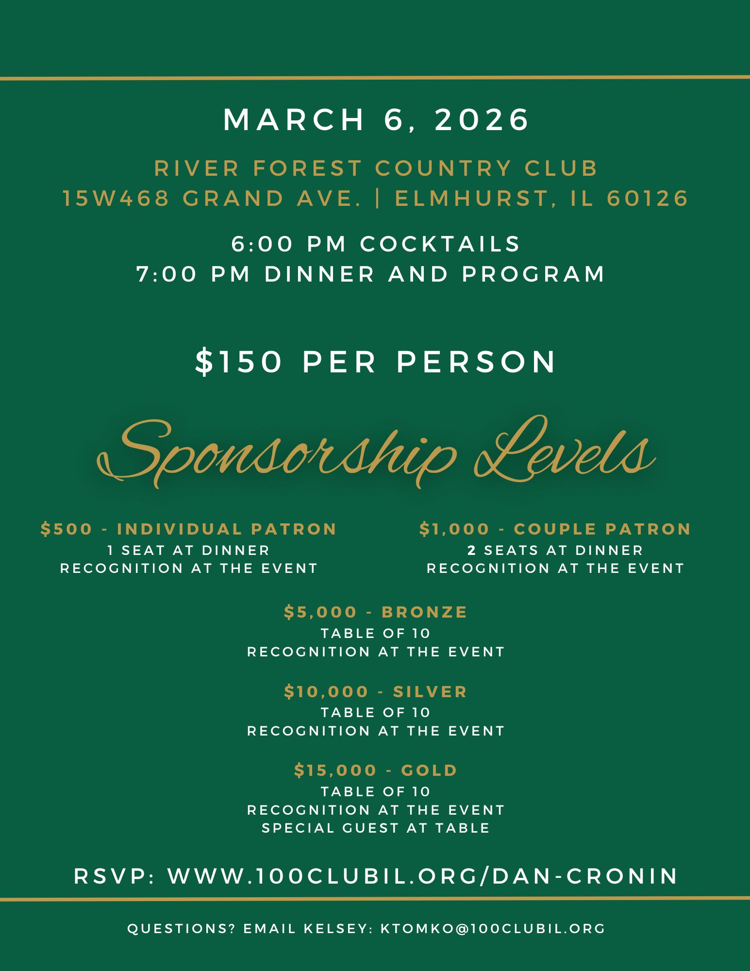 Tickets and sponsorship opportunities are available and listed below. Questions? Contact Kelsey – KTomko@100clubil.org