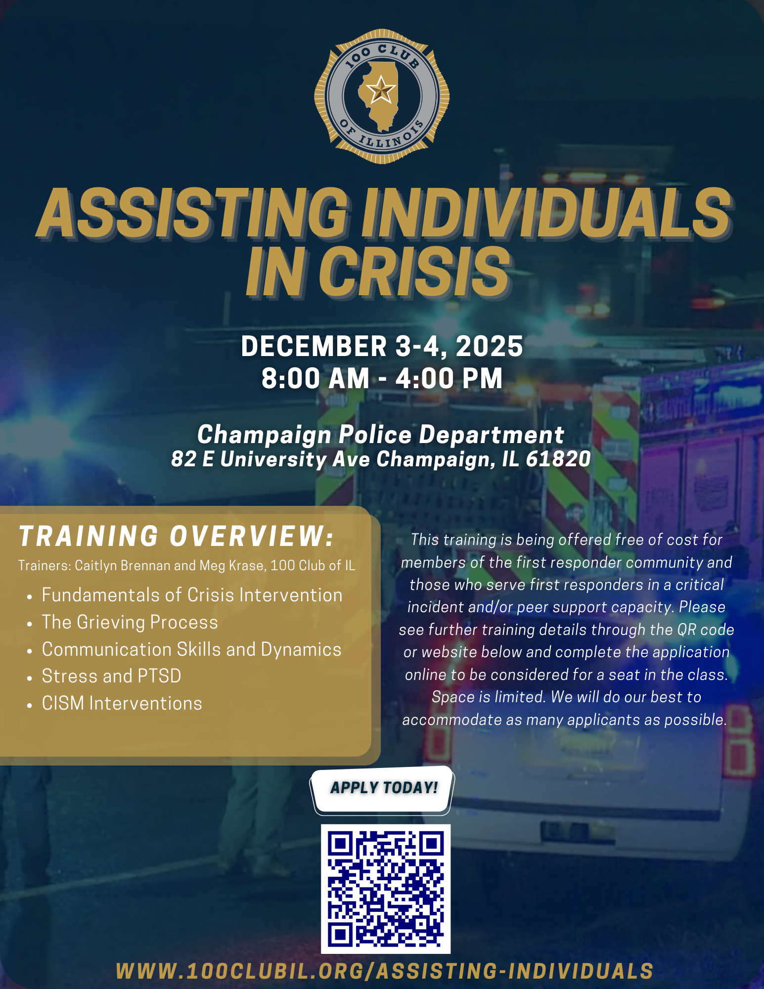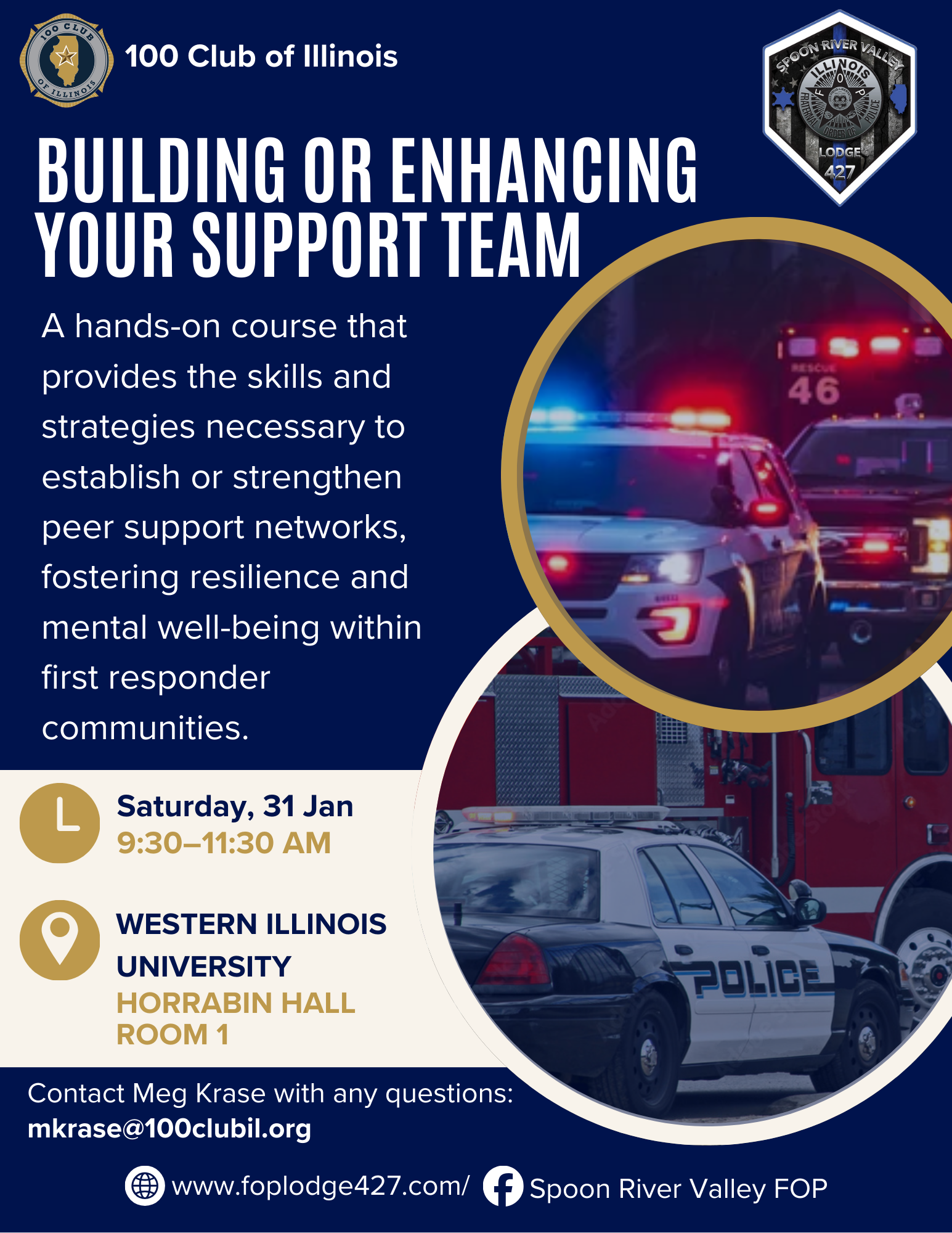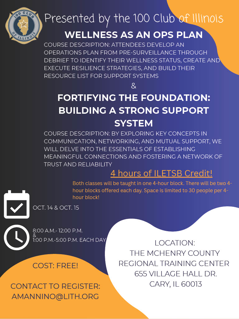 Please, make your requests and send a message to Caitlyn at cbrennan@100ClubIL.org or Meg at mkrase@100clubIL.org. Departments seeking specific wellness training or resources may also apply for our wellness funding..