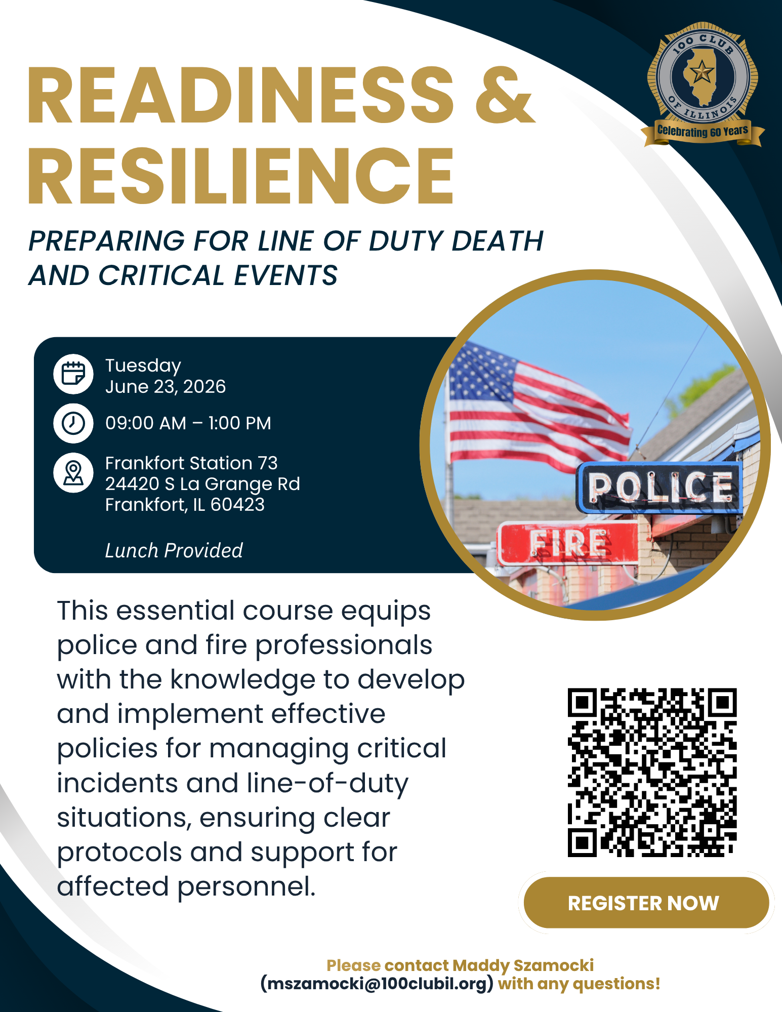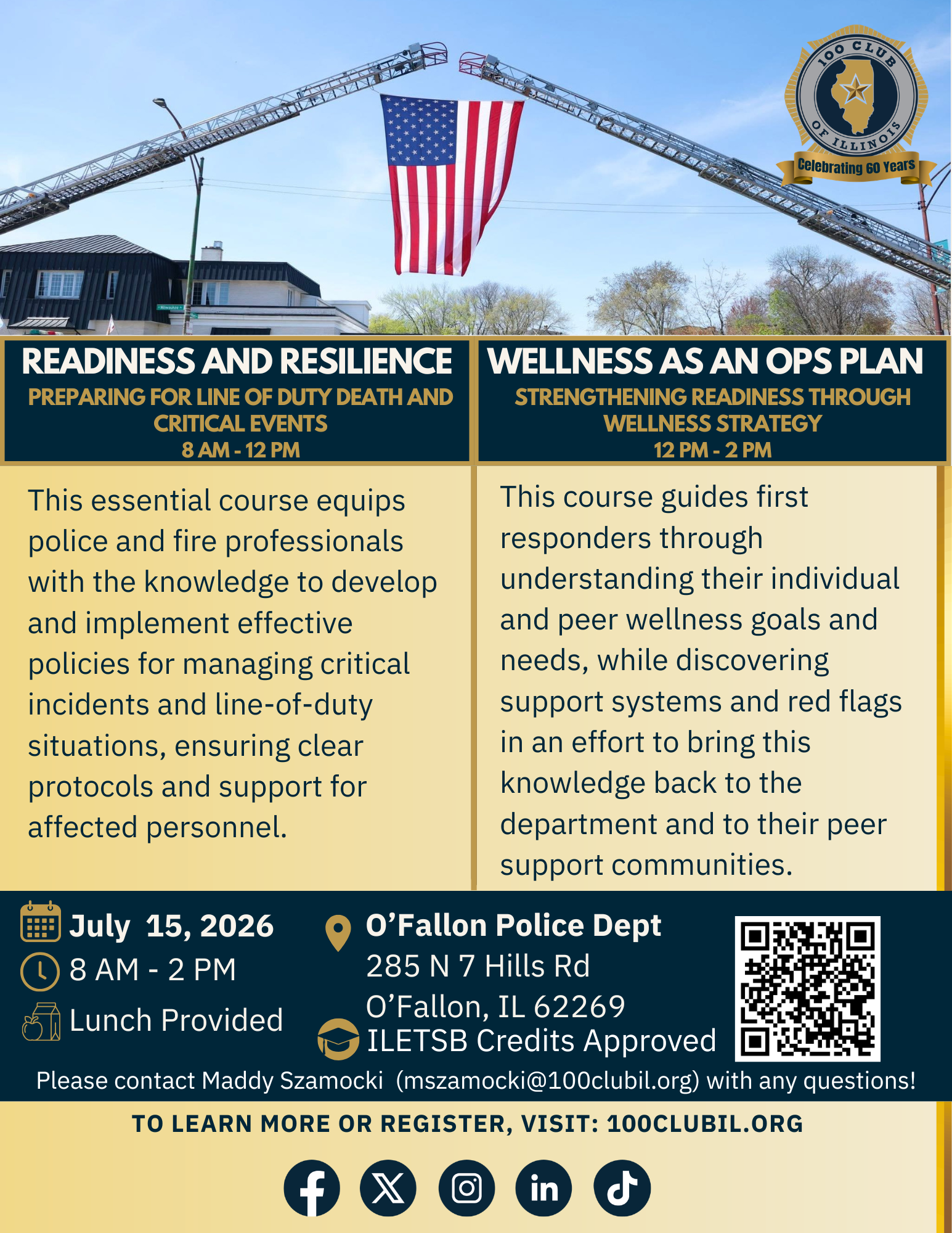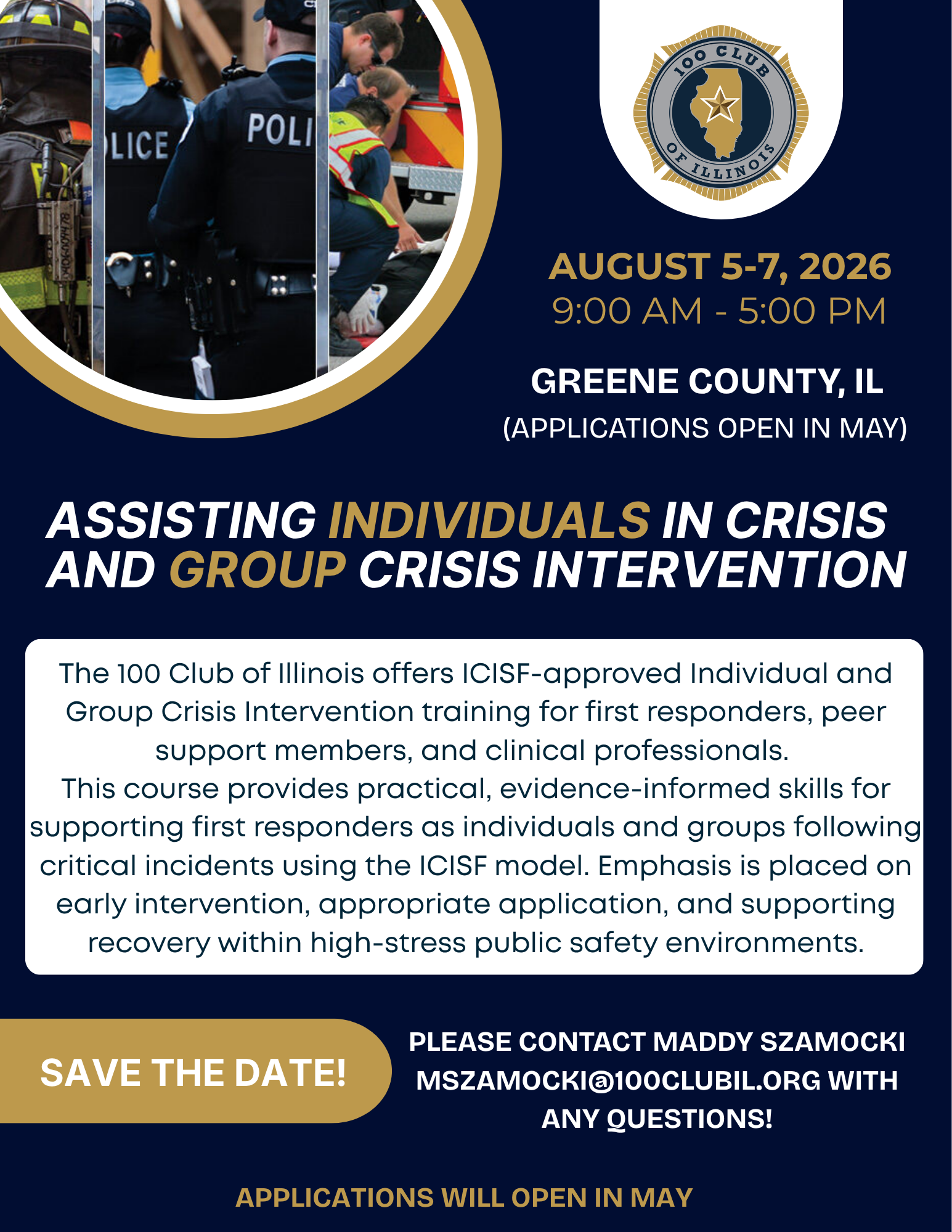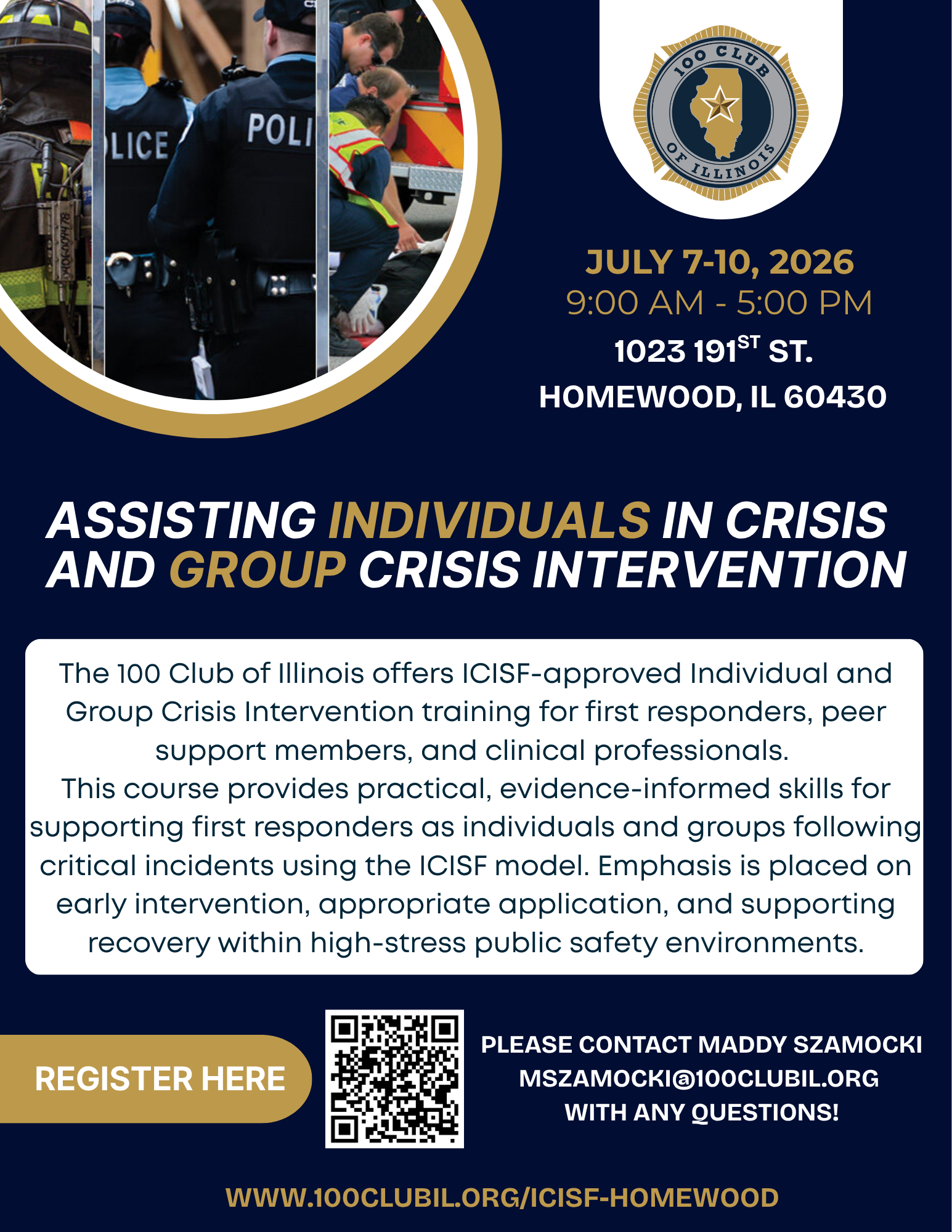 The 100 Club of Illinois is committed to providing ongoing, high-quality training opportunities for active-duty first responders and departments across the state. Our training offerings address critical areas such as Critical Incident Stress Management (CISM), peer support, department-wide wellness initiatives, and individual resilience. These programs are designed to equip first responders with practical tools that support safety, readiness, and sustained performance, ensuring they are prepared to meet the demands of the job at the highest level.